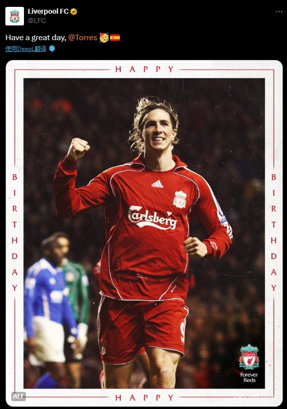 利物浦官方社交媒体晒出了为托雷斯特意制作的生日海报,并写道:“祝你度过一个美好的生日。”并在文末艾特了西班牙球星。