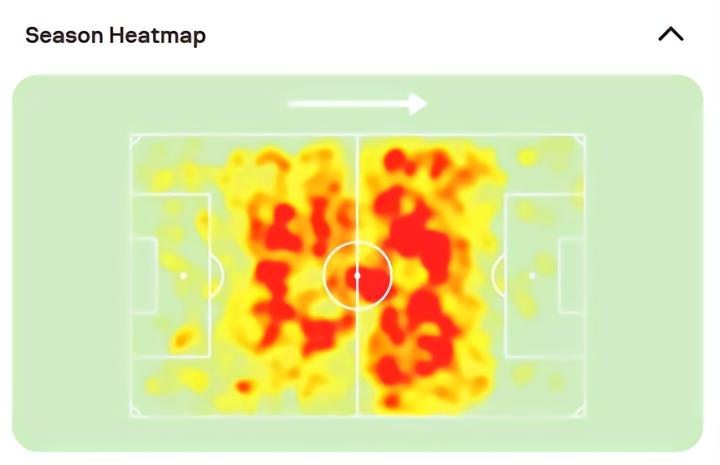 数据网站Sofascore的热力图显示长谷川唯在中场的活动非常活跃
