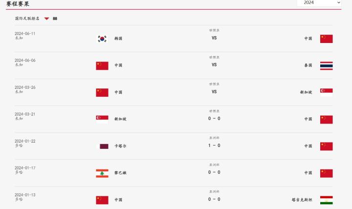 比赛还尚未开始,中国足协官网的赛程赛果中显示国足客场0-0战平新加坡,目前尚不知为何会显示该比分,剩余未开始的比赛则显示VS。