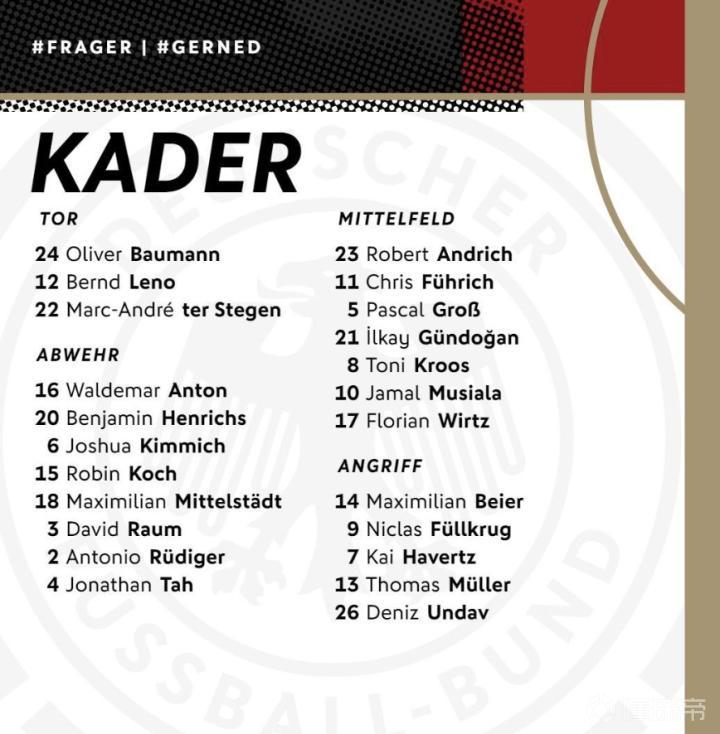 中场:23号安德里希(勒沃库森)、11号菲里希(斯图加特)、5号格罗斯(布莱顿)、21号京多安(巴萨)、8号托尼-克罗斯(皇马)、10号穆西亚拉(拜仁)、17号维尔茨(勒沃库森)