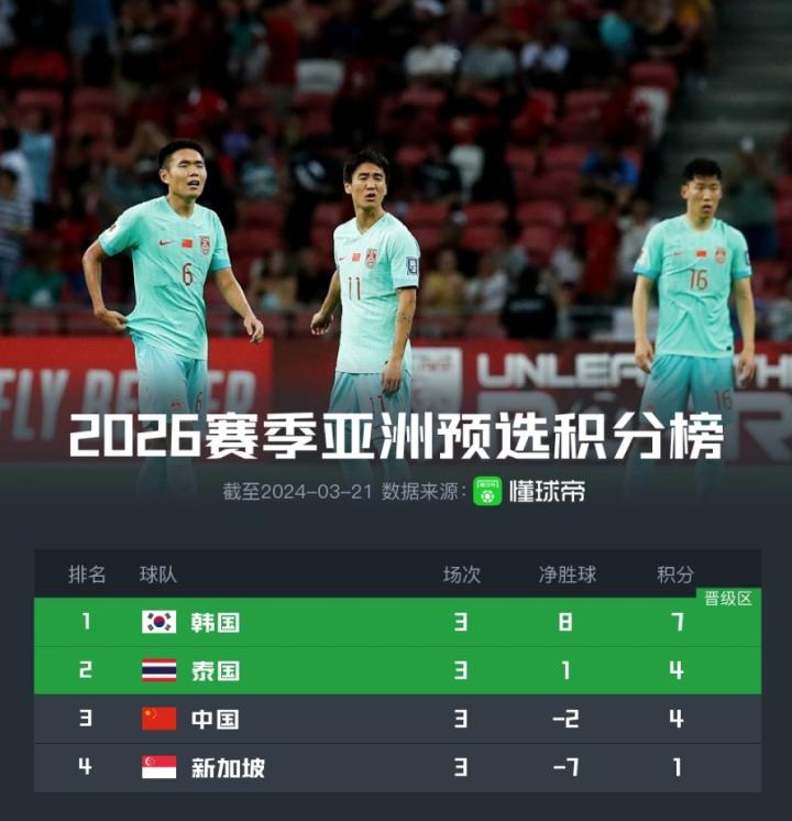 世预赛小组积分榜:国足与泰国同积4分,泰国凭净胜球领先