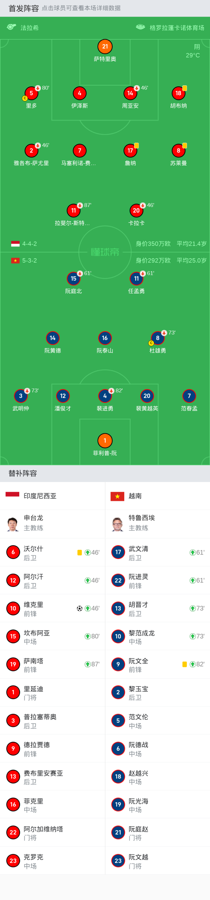 印度尼西亚首发:8-苏莱曼, 4-伊泽斯, 14-周亚安, 5-里多, 21-萨特里奥, 7-马塞利诺-费迪南, 18-胡布纳, 20-卡拉卡, 17-詹纳, 11-拉斐尔-斯特鲁伊克, 2-雅各布-萨尤里