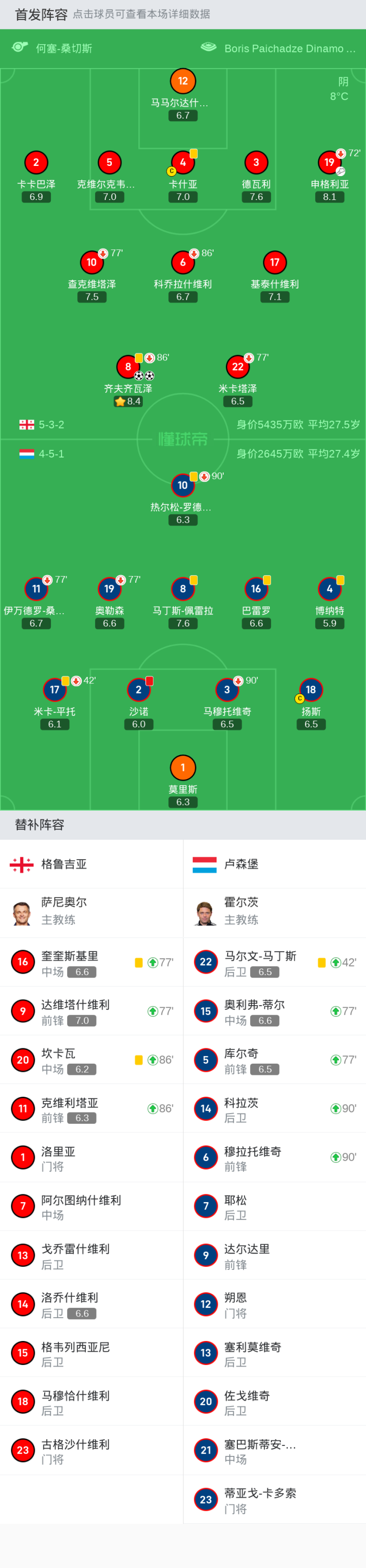 替换下场:86'8-齐夫齐瓦泽, 72'19-申格利亚, 86'6-科乔拉什维利, 77'10-查克维塔泽, 77'22-米卡塔泽