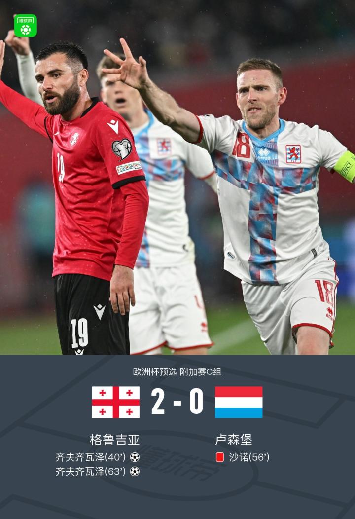 北京时间3月22日欧洲杯预选 附加赛C组,格鲁吉亚主场对阵卢森堡。上半场,齐夫齐瓦泽推射破门。下半场,沙诺染红,齐夫齐瓦泽再下一城梅开二度,申格利亚任意球攻门击中门框,最终,格鲁吉亚2-0卢森堡晋级欧洲杯预选赛附加赛决赛。