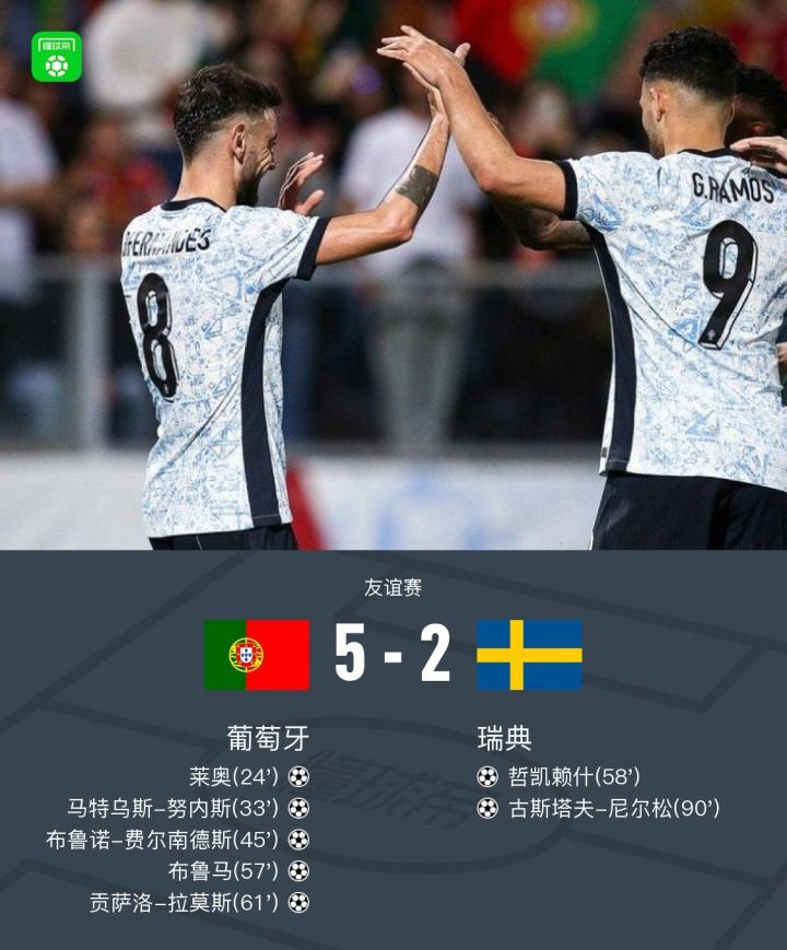 北京时间3月22日友谊赛,葡萄牙主场对阵瑞典。上半场莱奥补射率先破门,努内斯一条龙扩大比分,B费推射进球,下半场B费助攻布鲁马破门,哲凯赖什扳回一球,贡萨洛-拉莫斯推射空门得分,尼尔松最后时刻头球打入死角,最终葡萄牙5-2战胜瑞典。