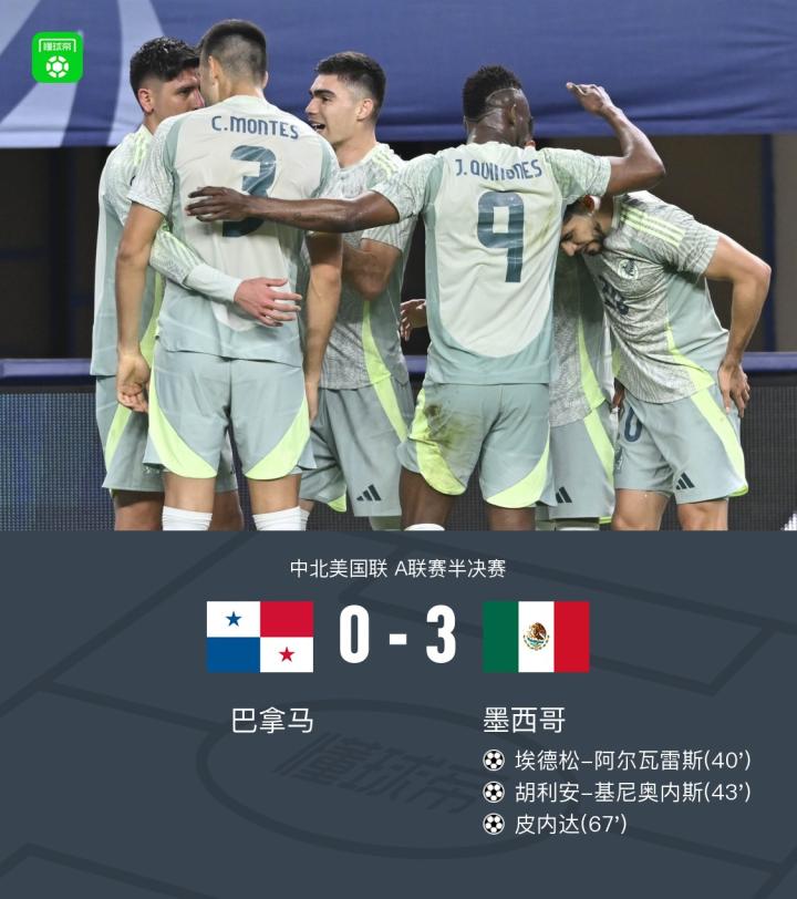 北京时间3月22日中北美国联 A联赛半决赛,巴拿马主场对阵墨西哥。上半场,路易斯-查韦斯助攻,埃德松-阿尔瓦雷斯破门打破僵局。亨利-马丁助攻,胡利安-基尼奥内斯破门将比分扩大。下半场,奥乔亚门神附体,法哈多和迪亚斯的近距离攻门均被化解。塞萨尔-蒙特斯助攻皮内达破门,客队再下一城。沃特曼越位在先,进球被吹无效。最终墨西哥客场3-0战胜巴拿马。