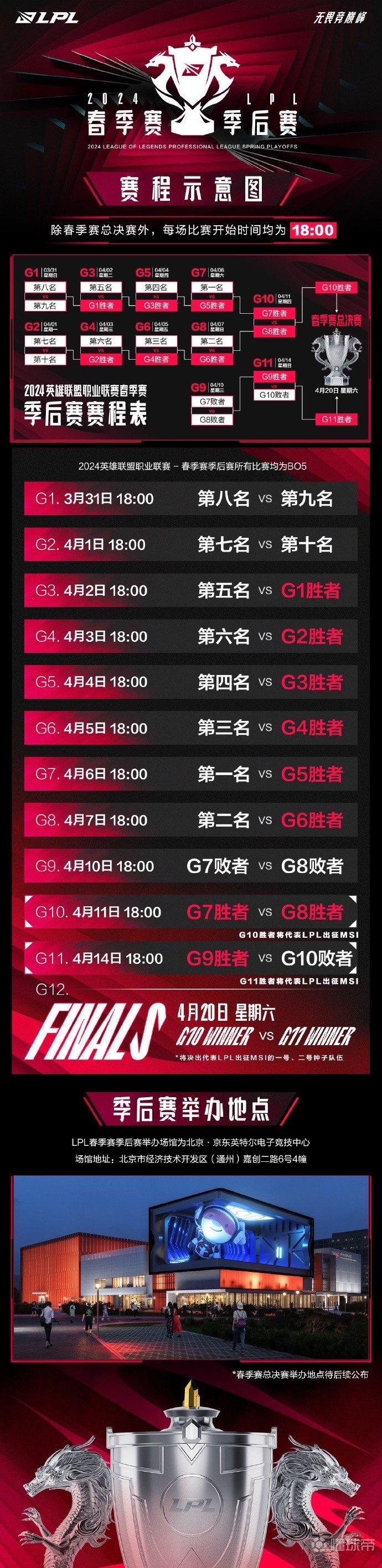 2024英雄联盟职业联赛(LPL)春季赛常规赛已接近尾声,季后赛将于3月31日正式开始,且季后赛每场比赛开始时间均为18:00(春季赛总决赛除外)。