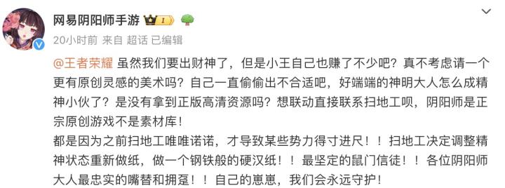 《阴阳师》官方微博@王者荣耀 发文称,“虽然我们要出财神了,但是小王自己也赚了不少吧?真不考虑请一个更有原创灵感的美术吗?自己一直偷偷出不合适吧,好端端的神明大人怎么成精神小伙了?是没有拿到正版高清资源吗?想联动直接联系扫地工呗,阴阳师是正宗原创游戏不是素材库!”疑似暗示《王者荣耀》角色有抄袭的嫌疑。