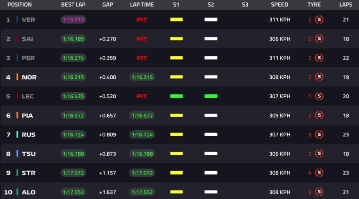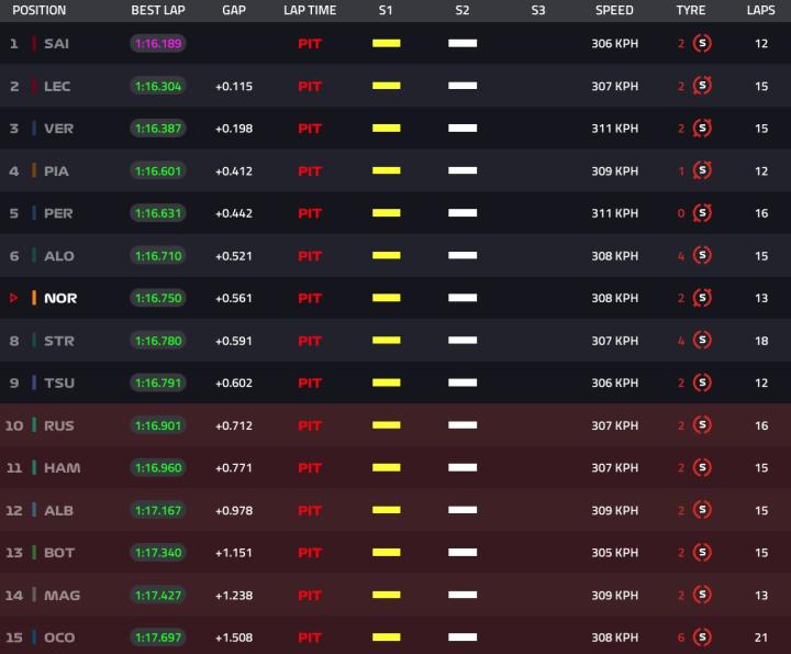 第一个飞行圈结束后,维斯塔潘、皮亚斯特里、塞恩斯位列前3。