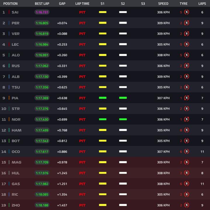 时间还剩5分钟,佩雷兹、维斯塔潘做出了第2、第3名的成绩,塞恩斯继续留在了第1。