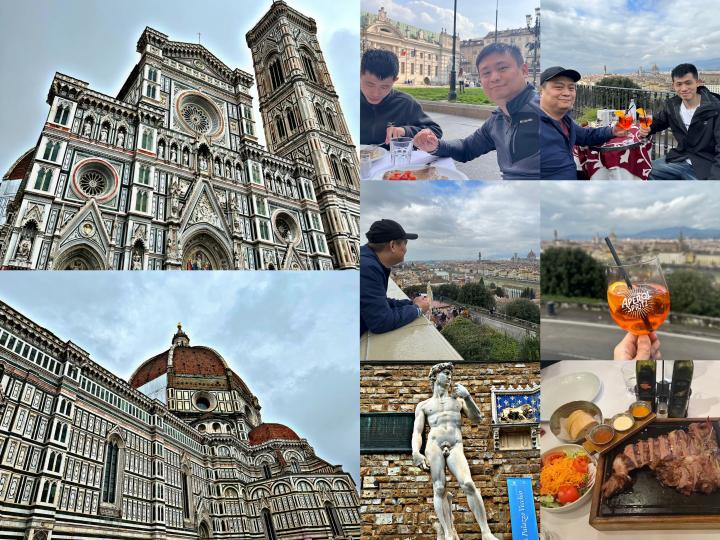 次日一早,大家乘坐火车前往佛罗伦萨一日游,一起感受文艺复兴发源地的独特魅力。游览圣母百花大教堂、近距离欣赏“大卫”等著名雕塑艺术品、在city walk之余品尝美食美酒:意大利火腿和剔骨牛排太好吃啦!