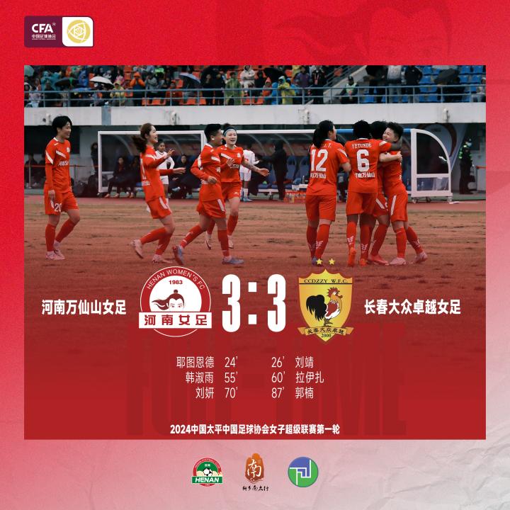 河南万仙山女足3-3长春大众卓越女足 耶图恩德、韩淑雨、刘妍破门 北京时间3月24日15:00,2024中国太平中国足球协会女子超级联赛首轮,河南万仙山女足在主场新乡市体育中心体育场迎战长春大众卓越女足。河南俱乐部酒祖杜康球员代表及8000余名球迷冒雨来到现场观赛。 上半场第24分钟,外援耶图恩德门前抢点得手,帮助河南万仙山女足打进赛季首球。随后,刘靖头球破门扳平比分。 易边再战,第55分钟,韩淑雨原地抽射破门,河南万仙山女足再度领先。第60分钟,拉伊扎抢射,客队第二次扳平比分。第70分钟,刘妍门前垫射帮助河南万仙山女足再次领先。第87分钟,郭楠远射破门,客队第三次扳平比分。 最终,河南万仙山女足在主场3-3战平长春大众卓越女足。北京时间3月30日15:00,河南万仙山女足将前往客场挑战武汉车谷江大女足。