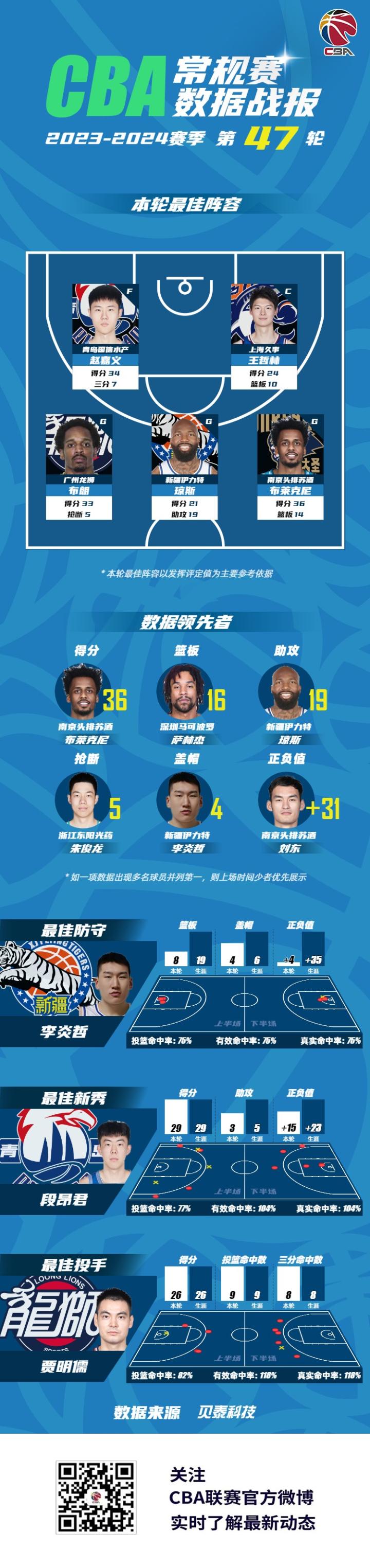 2023-2024赛季CBA联赛常规赛第47轮结束较量,来自青岛国信海天篮球俱乐部的赵嘉义 、上海久事大鲨鱼的王哲林、龙狮篮球俱乐部的布朗、新疆广汇篮球俱乐部的琼斯和南京同曦篮球俱乐部的布莱克尼入选CBA联赛常规赛第47轮最佳阵容!
