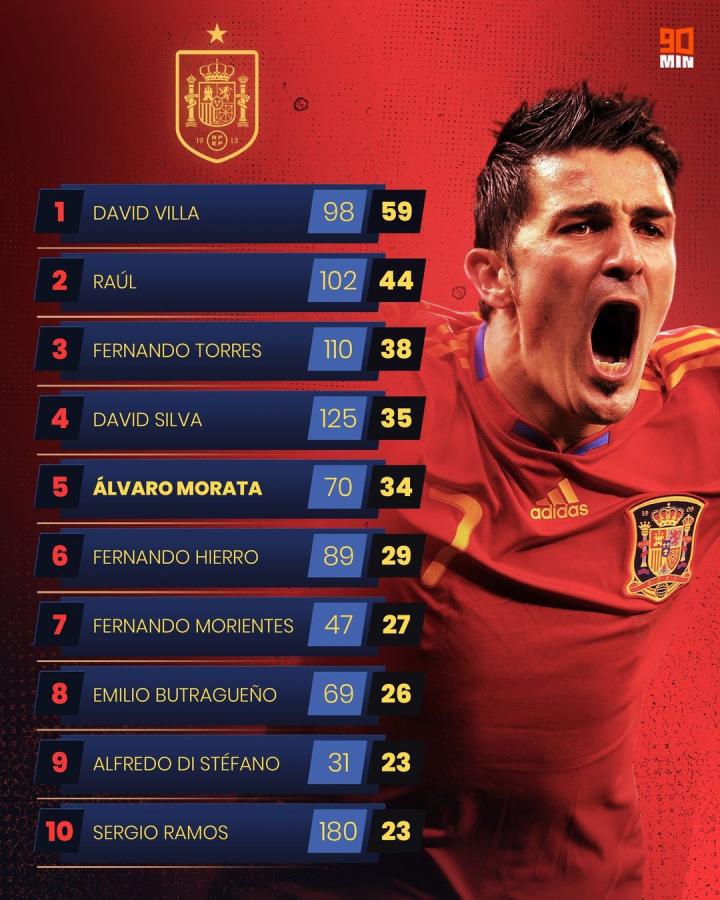 西班牙国家队进球排行榜:(图二是8强的射手榜第一)