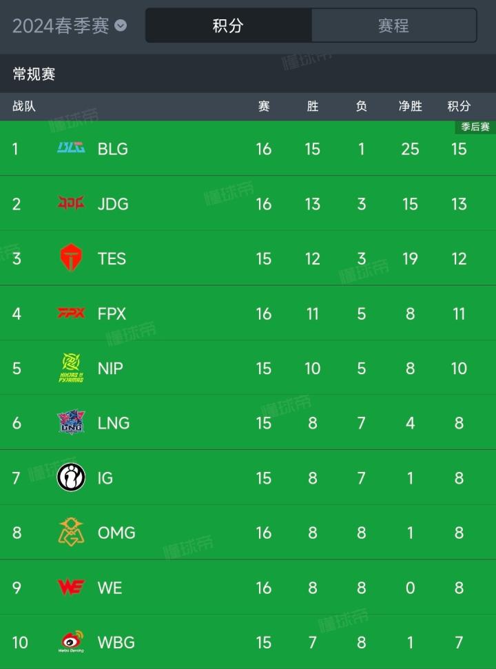 2024LPL春季赛季后赛的队伍分别是:BLG、JDG、TES、NIP、FPX、LNG、iG、OMG、WBG和WE。无缘季后赛的队伍为:AL、TT、LGD、RNG、RA、EDG和UP。