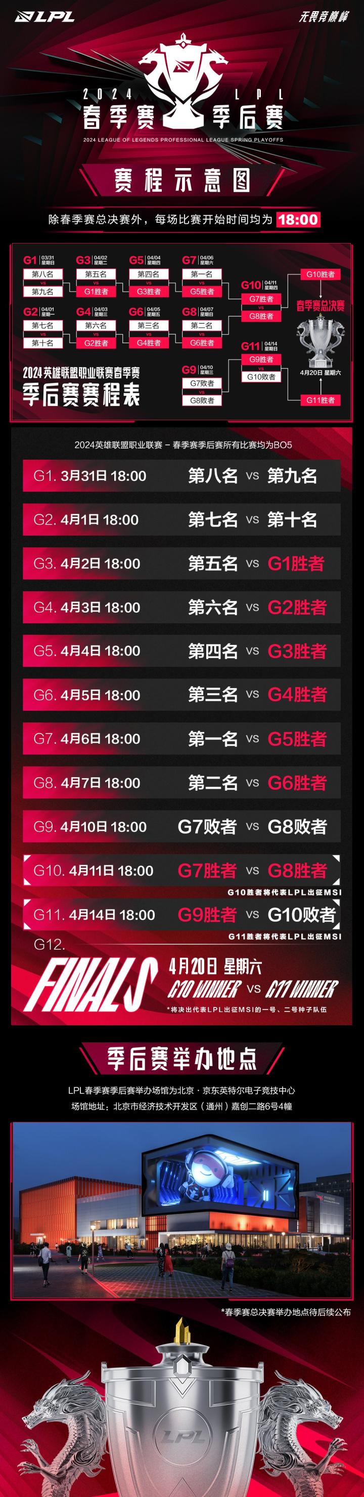 根据此前公布的赛程,季后赛首场比赛将在3月31日本周日开战,最终的决赛将在4月20日周六进行。今年拳头针对全球赛事进行了改革,今年在成都进行的MSI(季中邀请赛)的比赛,LPL将会有2个名额,春季赛的冠亚军都将参加今年的MSI比赛。