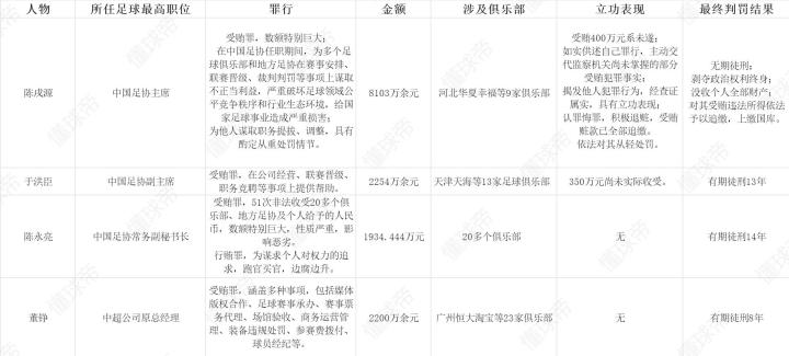 一图看懂四位前足坛高层罪行、涉案金额及判决结果这游戏太难了哈 @懂球帝2024-03-26 11:39北京时间2024年3月26日上午,湖北省黄石市中级人民法先后公布了原中国足协主席陈戌源、原中国足协副主席于洪臣、原中国足协常务副秘书长陈永亮和中超公司原总经理董铮的判决结果。四位前足坛高层曾经的职位、所犯罪行、涉案金额、涉及俱乐部、立功表现和一审的判决结果如图所示。展开更多