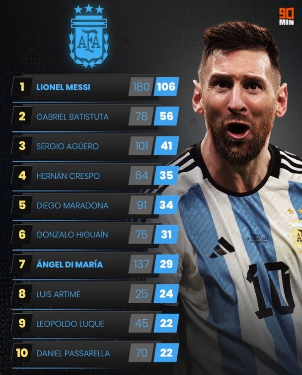 英国媒体《90min》统计盘点了阿根廷国家队队史射手榜情况:目前梅西是以106球位列榜首,巴蒂斯图塔56球排在次席,第三位是41球的阿圭罗。