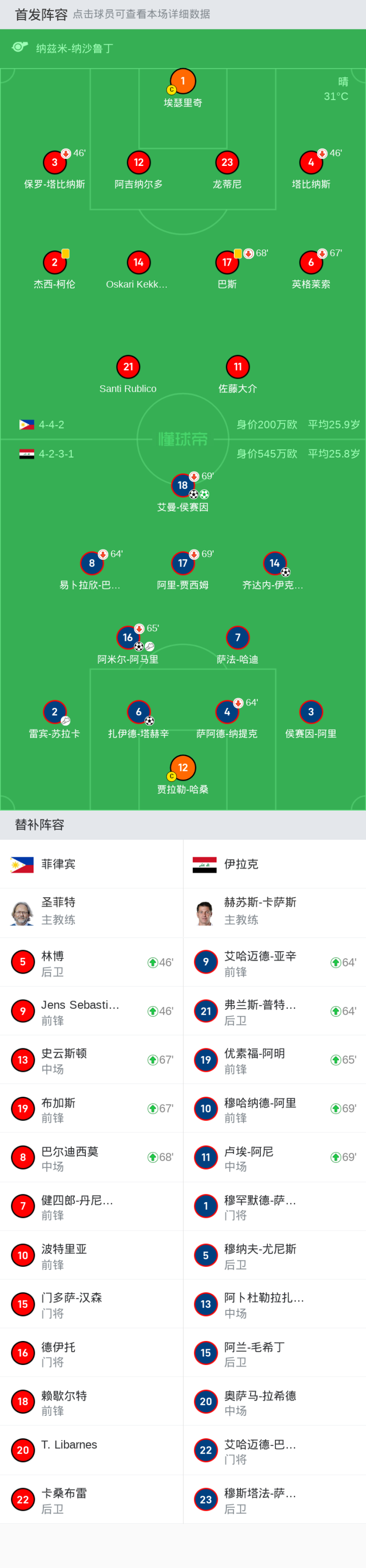 菲律宾首发:1-埃瑟里奇, 6-英格莱索, 12-阿吉纳尔多, 2-杰西-柯伦, 11-佐藤大介, 14-Oskari Kekkonen, 4-塔比纳斯, 17-巴斯, 23-龙蒂尼, 3-保罗-塔比纳斯, 21-Santi Rublico