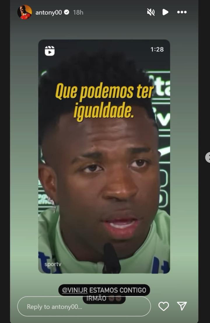 声援维尼修斯,安东尼社媒:我们与你同在,兄弟👊🏿