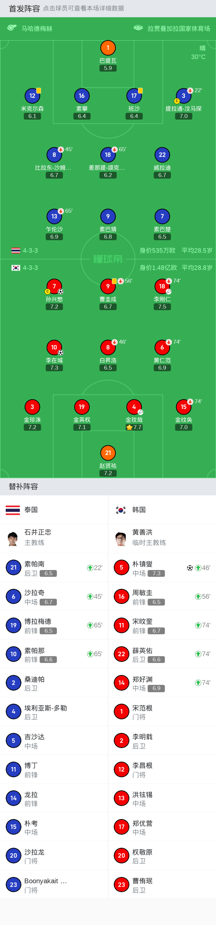 上场替补:45+2分钟6-沙拉奇, 22分钟21-素帕南, 65分钟10-素帕那, 65分钟19-博拉梅德