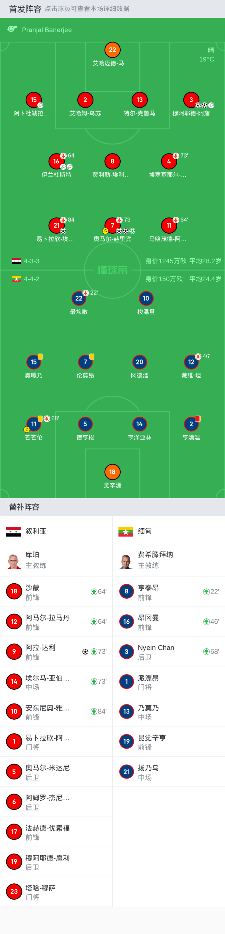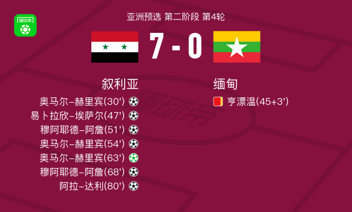 叙利亚7-0血洗缅甸,奥马尔-赫里宾帽子戏法,穆阿耶德-阿詹梅开二度