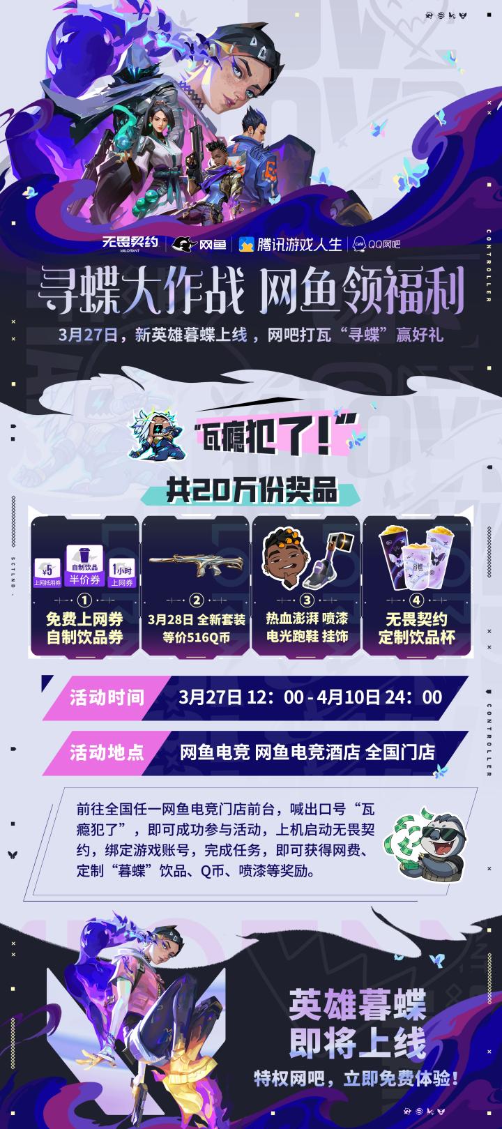 《无畏契约》联动网鱼电竞:大喊“瓦瘾犯了”即可参加活动ZeroTsu_02 @懂球帝2024-03-27 10:23《无畏契约》国服宣布联动网鱼:前往全国任一网鱼电竞门店前台,大声喊出口号——“瓦瘾犯了”,即可成功参与活动。启动《无畏契约》,绑定游戏账号,完成指定任务,赢取网费、Q币、喷漆等好礼,更有无畏契约定制“暮蝶”饮品杯等你品尝。《无畏契约》,又作瓦罗兰或瓦罗兰特,是一款由Riot Games开发的免费多人第一人称射击游戏。展开更多