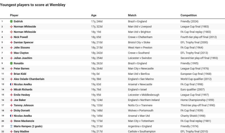 温布利进球最年轻球员排名:恩德里克第一,大罗第九