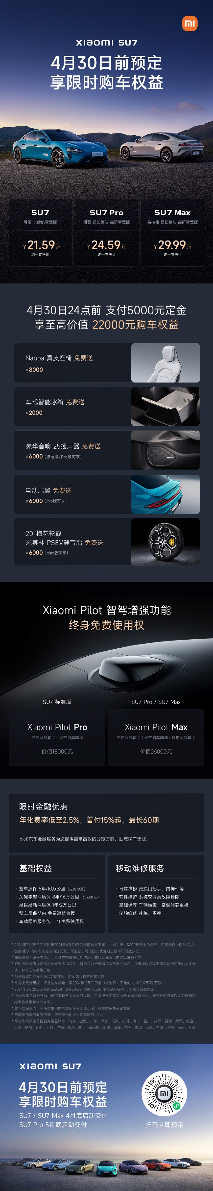 小米SU7提供九种颜色可供选择,标准版售价21.59万元,Pro版售价24.59万元,Max版售价29.99万元。此外还有小米SU7创始版和小米SU7Max创始版,限量5000台。通过小米汽车App、小米汽车微信小程序或全国 29 城的小米汽车零售门店均可订购,上市即交付,创始版最快4月3日交付,标准版及Max版、Pro版将分别于4月底、5月底交付。