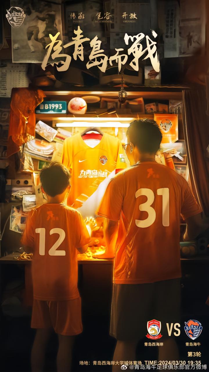 北京时间3月30日晚19:35,中超历史上首次青岛德比将在青岛西海岸大学城体育场上演。赛前,青岛海牛队发布了海报。