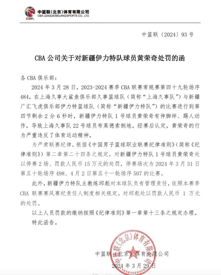 为严肃联赛纪律,根据《中国男子篮球职业联赛纪律准则》(简称《纪律准则》)第二章第二十四条之规定,对新疆队1号球员黄荣奇处以停赛2场、罚款人民币15万元的处罚,停赛场次为2024年3月31日第五十轮场序498、4月2日第五十一轮场序507的比赛。