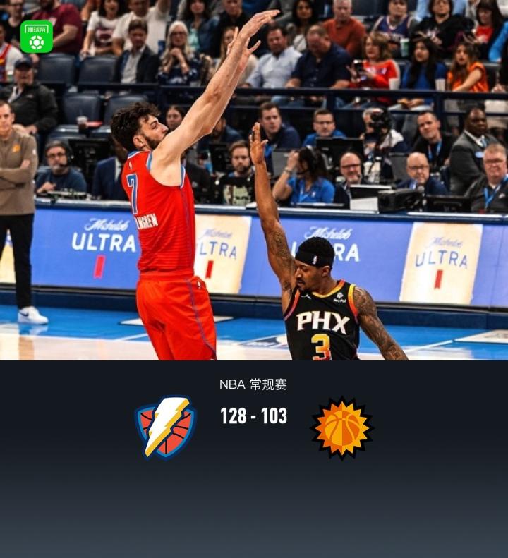 第四节雷霆卡森-华莱士拿下9分,太阳利特尔拿下7分,最终雷霆128-103战胜太阳