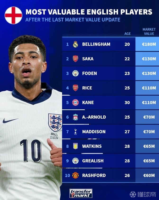在完成最新更新后,德国转会市场网站更新了英格兰球员的身价榜,贝林厄姆断层榜首。