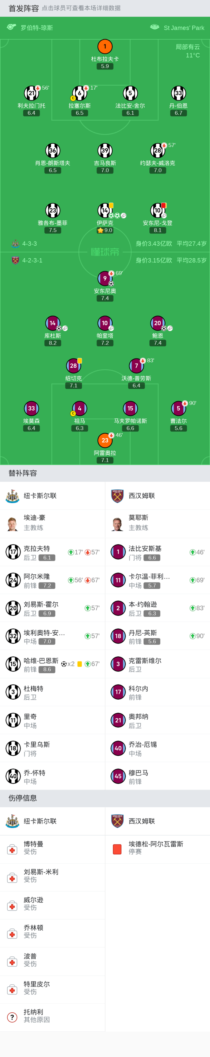 上场替补:46分钟1-法比安斯基, 90+3分钟18-丹尼-英斯, 69分钟11-卡尔温-菲利普斯, 83分钟2-本-约翰逊