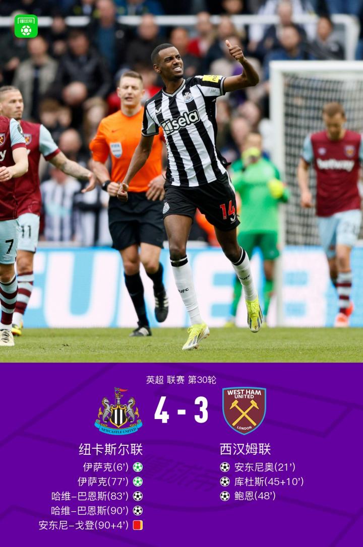 北京时间3月30日英超联赛第30轮,纽卡斯尔联主场对阵西汉姆联。上半场开场不久,戈登造点,伊萨克罚入。随后,安东尼奥单刀扳平比分。上半场结束前,库杜斯帮助铁锤帮反超比分。下半场,鲍恩再下一城。随后风云突变,菲利普斯踢倒戈登送点,伊萨克罚入。替补登场的巴恩斯连入两球,帮助纽卡反超比分。终场前,戈登吃到第二张黄牌被罚下。全场比赛结束,纽卡下半场连入三球4-3力克西汉姆联。
