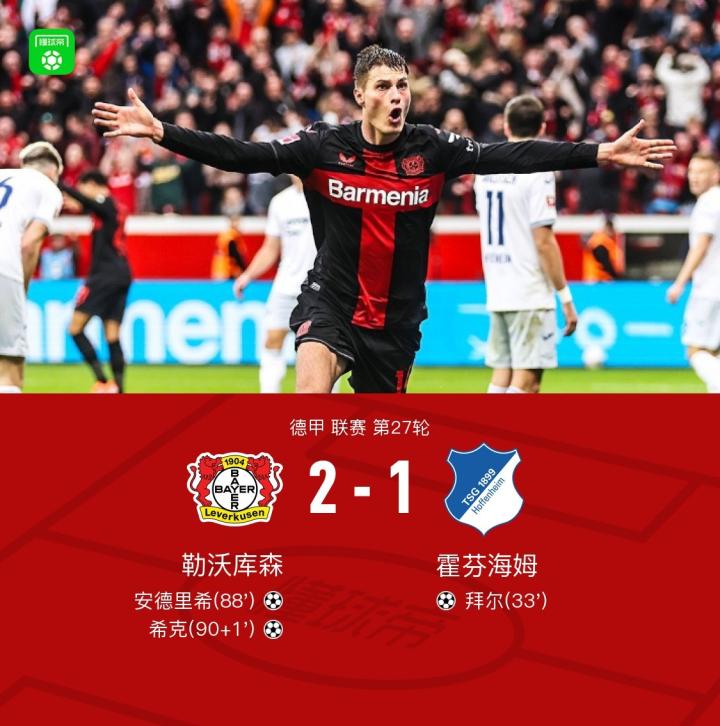 逆转+绝杀!勒沃库森2-1霍芬海姆,安德里希扳平,希克绝杀
