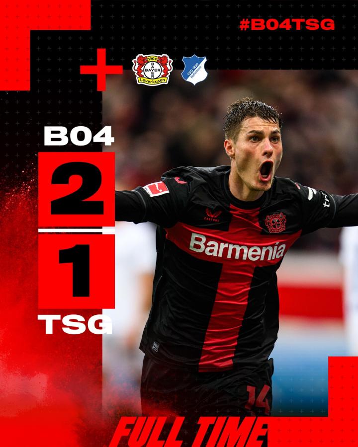 主场2-1逆转霍芬海姆,勒沃库森本赛季不败纪录延续至39场JayStones @懂球帝2024-03-31 00:25在刚刚结束的德甲第27轮比赛中,勒沃库森主场2-1逆转霍芬海姆。这也就意味着勒沃库森本赛季各项赛事不败的纪录延续到了39场,在这39场比赛中,他们取得了34胜5平进111球丢31球的成绩,而且是五大联赛唯一一支保持不败战绩的球队。在这场比赛结束后,勒沃库森在德甲积分榜以23胜4平的成绩积73分排在第一名,领先少赛一轮的拜仁13分。展开更多