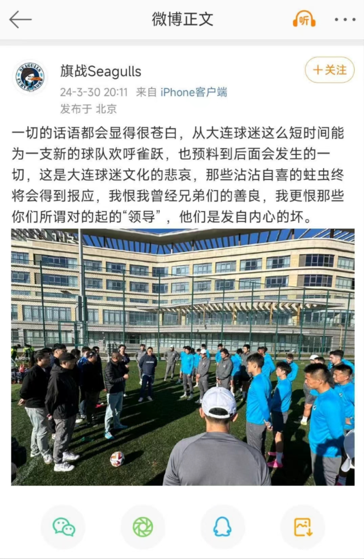 球员感动,球迷高兴,球队赢球。这本应该是皆大欢喜,但总有一些事情令人不快。赛后,原“旗战seagulls”球迷团体微博账号发表了不和谐的言论,声称“这是大连球迷文化的悲哀”。