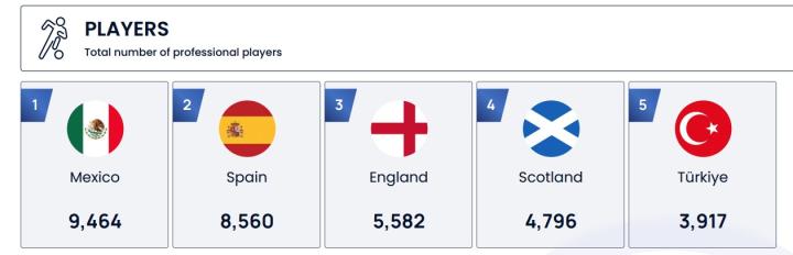 墨西哥之后,排在二至五位的是西班牙(8560名职业球员)、英格兰(5582人)、苏格兰(4796人)和土耳其(3917人)。被国际足联禁赛的俄罗斯,职业球员人数有3633人,在欧洲排在第五。