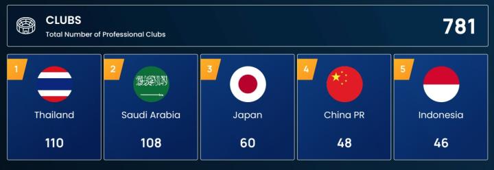 亚足联总计有781家职业俱乐部,最多的是泰国,有110个,比中国的48家(中超16家+中甲16家+中乙16家,新赛季中乙已经增加至20家俱乐部)一倍还多。日本有60家职业俱乐部,近年来大力发展足球的沙特有108家俱乐部。