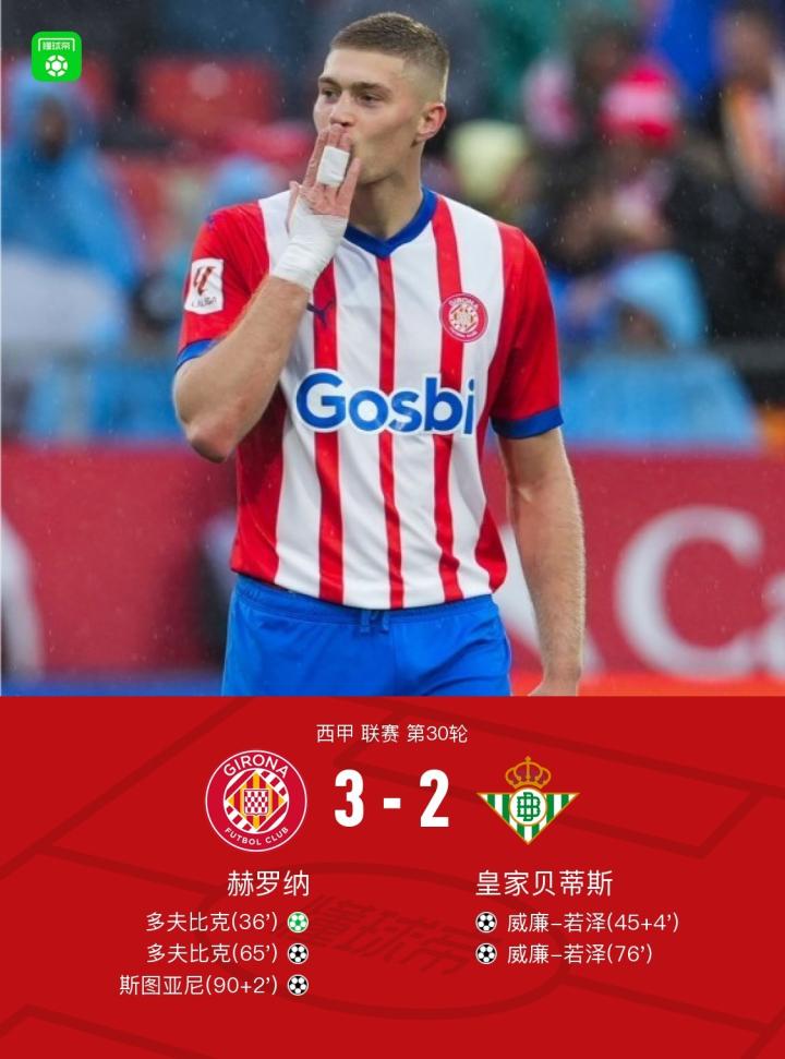赫罗纳3-2贝蒂斯,多夫比克梅开二度,斯图亚尼补时绝杀