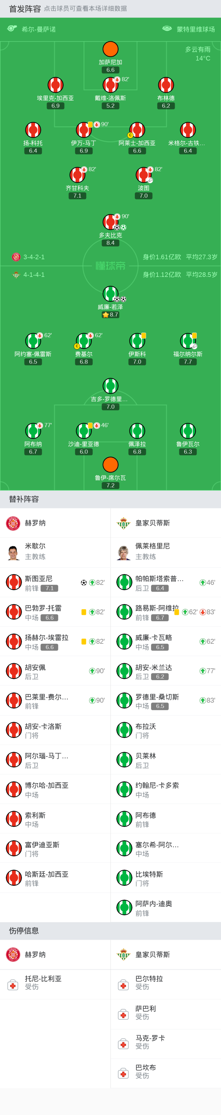 赫罗纳首发:17-布林德, 5-戴维-洛佩斯, 13-加萨尼加, 24-波图, 8-齐甘科夫, 14-阿莱士-加西亚, 9-多夫比克, 23-伊万-马丁, 25-埃里克-加西亚, 3-米格尔-古铁雷斯, 20-扬-科托
