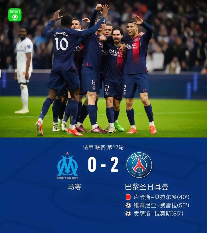 在法甲联赛第27轮的比赛中,马赛队在主场迎战巴黎圣日耳曼。上半场,韦勒图远射击中立柱,卢卡斯-贝拉尔多犯规染红。下半场,登贝莱助攻维蒂尼亚破门,姆巴佩在第65分钟被提前换下,阿森西奥助攻拉莫斯锁定胜局,最终,巴黎客场2-0马赛。