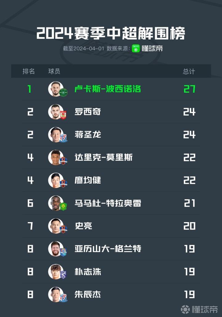 懂球帝有数2024赛季中超联赛前3轮战罢,根据懂球帝统计的球员解围榜显示:浙江队的卢卡斯-波西诺洛以27次领跑,长春亚泰的罗西奇和上海申花的蒋圣龙并列第二。