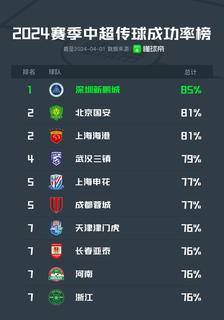 中超传球成功率榜:新鹏城85%居首,国安、海港81%并列第二懂球帝有数 @懂球帝2024-04-01 11:47中超前三轮战罢,升班马深圳新鹏城以85%高居中超传球成功率榜首位,国安和海港以81%并列第二。2024赛季中超传球成功率榜1 深圳新鹏城 85%2 北京国安 81%2 上海海港 81%4 武汉三镇 79%5 上海申花 77%5 成都蓉城 77%7 天津津门虎 76%7 长春亚泰 76%7 河南 76%7 浙江 76%展开更多