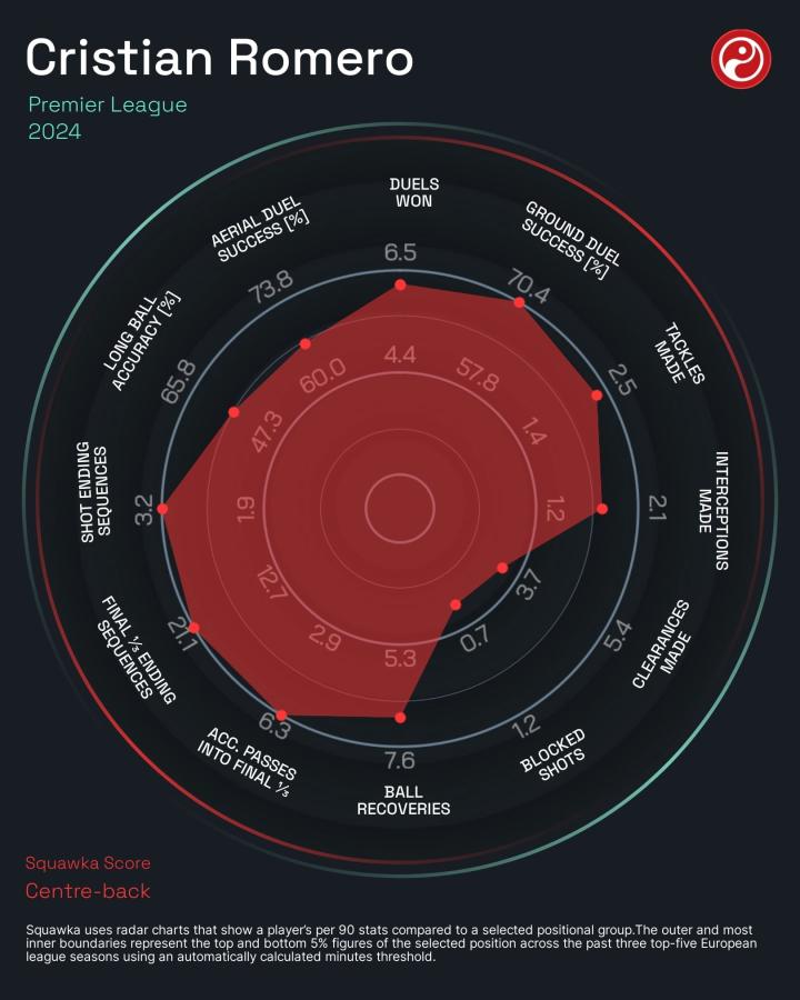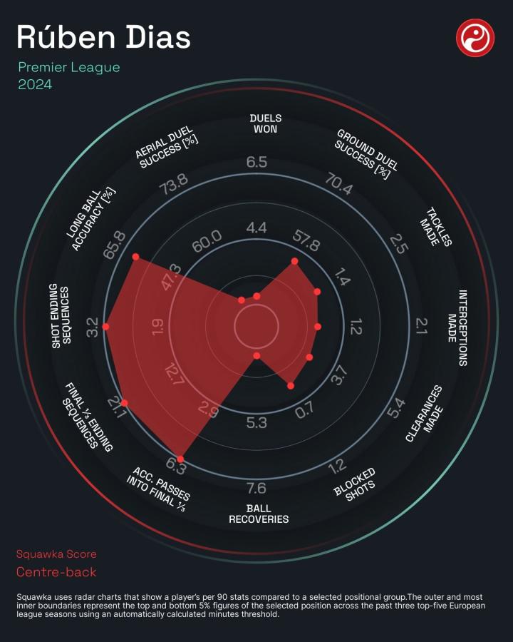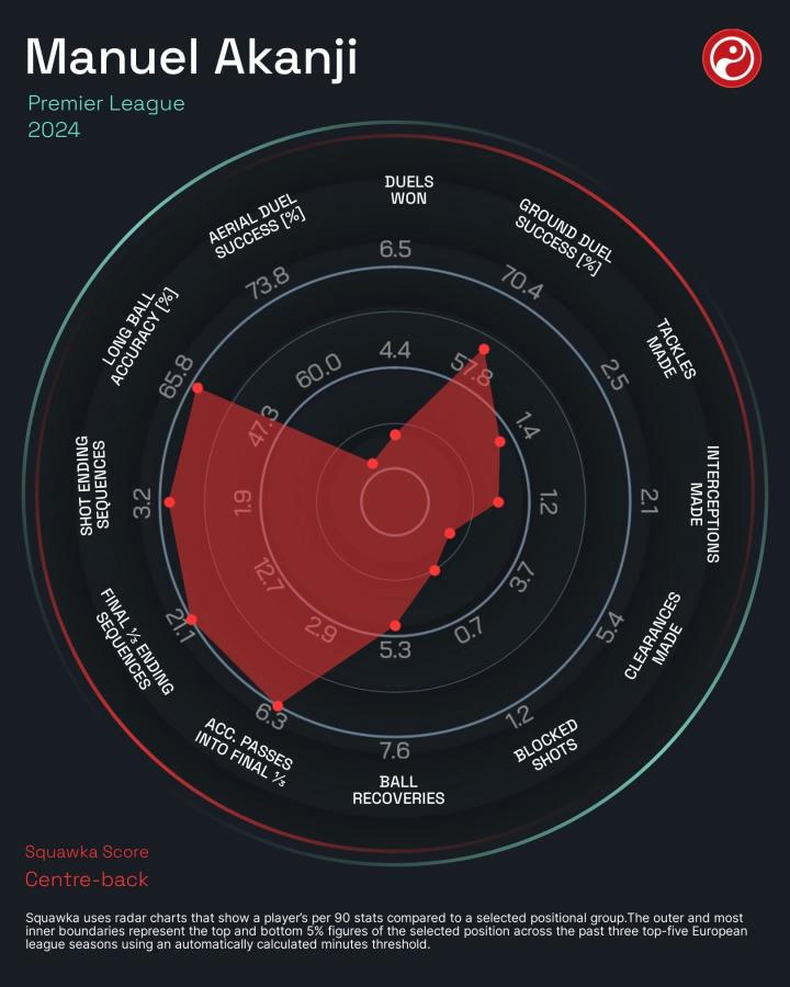 据介绍,该网站评分基于30种不同的指标,包括地面和空中对抗成功率、拦截、最后一人完成铲断 、比赛纪律、解围、长传准确度和向前传球准确度。每项统计数据的权重都凸显了中后卫比赛中最重要的方面。
