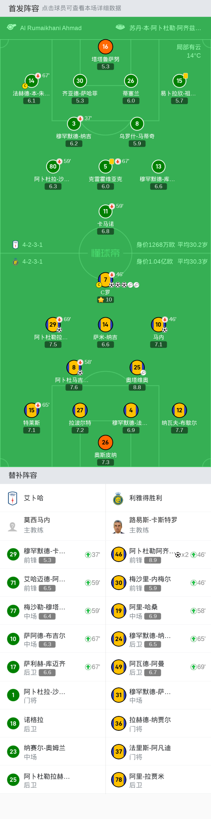 替换下场:46分钟7-C罗, 65分钟15-特莱斯, 46分钟10-马内, 58分钟8-阿卜杜马吉德-苏莱希姆, 69分钟29-阿卜杜勒拉赫曼-加里卜