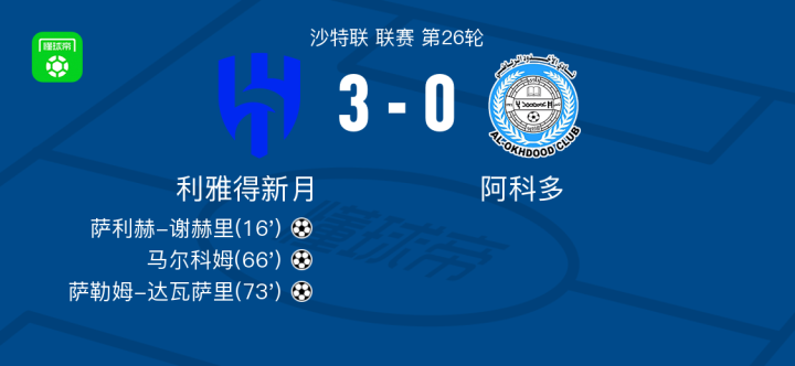 在沙特联赛第26轮比赛中,利雅得新月队在主场迎战阿科多队。萨利赫-谢赫里、马尔科姆和萨勒姆-达瓦萨里分别攻入进球,最终比分3-0,利雅得新月队取得胜利。