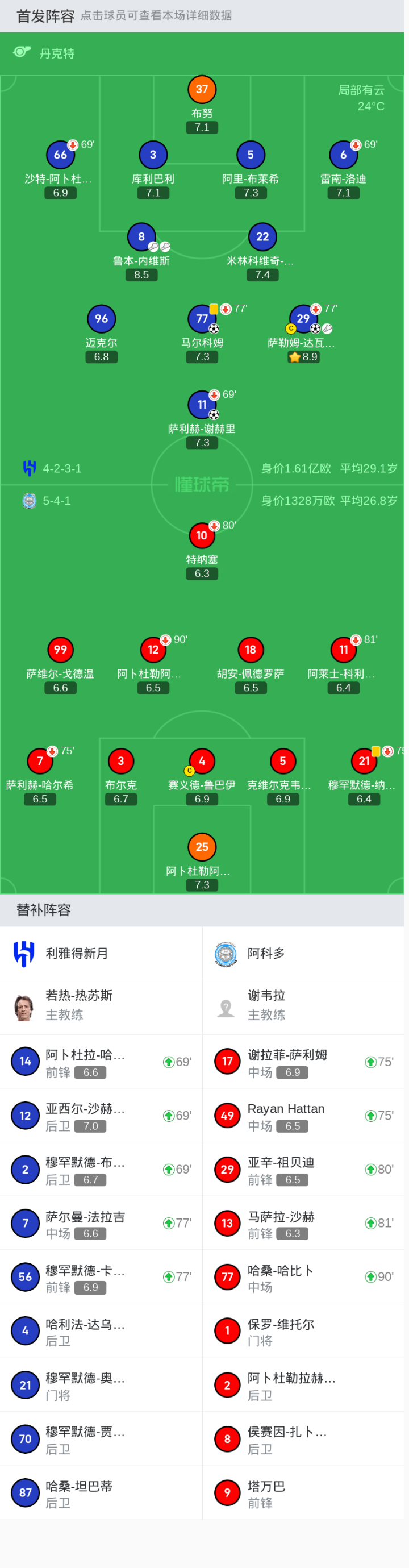 阿科多首发:5-克维尔克韦利亚, 10-特纳塞, 3-布尔克, 99-萨维尔-戈德温, 4-赛义德-鲁巴伊, 11-阿莱士-科利亚多, 18-胡安-佩德罗萨, 7-萨利赫-哈尔希, 25-阿卜杜勒阿齐兹-阿卜杜勒拉赫马, 21-穆罕默德-纳伊夫, 12-阿卜杜勒阿齐兹-赫特拉