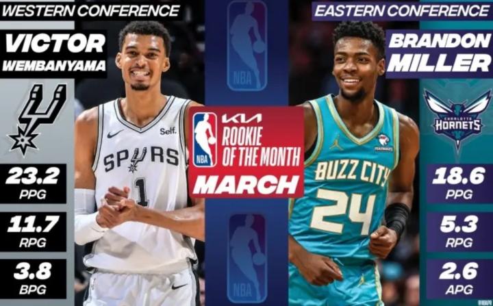 实至名归!文班亚马、布兰登-米勒当选NBA3月份月最佳新秀onegolden @懂球帝2024-04-03 09:01北京时间4月3日,NBA官方公布了3月份月最佳新秀奖项,马刺队新秀文班亚马(西部)与黄蜂队新秀布兰登-米勒(东部)分别当选。在三月份,文班亚马场均可以贡献23.2分11.7篮板3.8助攻,布兰登-米勒场均可以贡献18.6分5.3篮板2.6助攻。展开更多